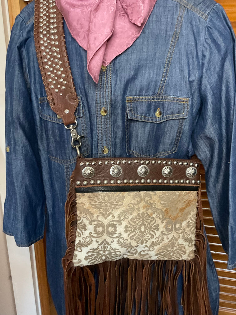 The Rockin Reba features a star-studded fringe design crafted from high-quality leather, providing a vintage aesthetic. This durable material ensures longevity while the fringe detail enhances movement and visual interest, making it ideal for fashion-forward individuals seeking both style and resilience in their accessories.