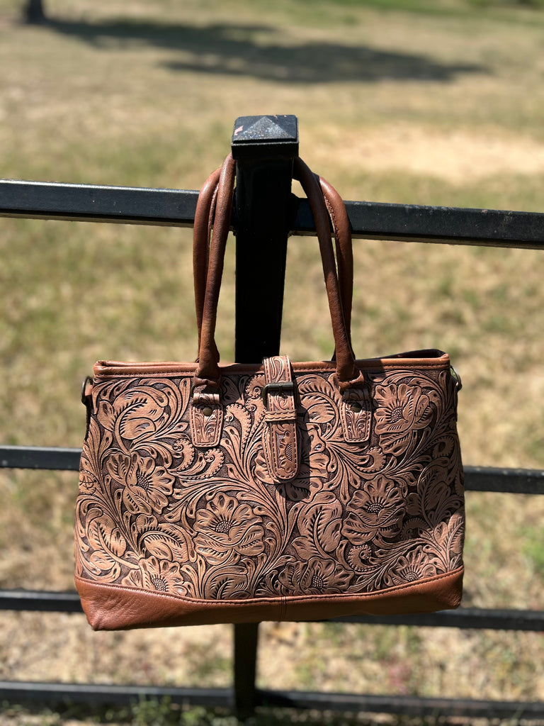 Introducing the Terrific Tricia: a Tooled Floral Leather shoulder bag that boasts both style and function. Made from high-quality leather, it offers durability and a touch of elegance to any outfit. The intricate floral design adds a unique touch, making it a standout piece. Practical and beautiful, it's a must-have for any fashion-forward individual.